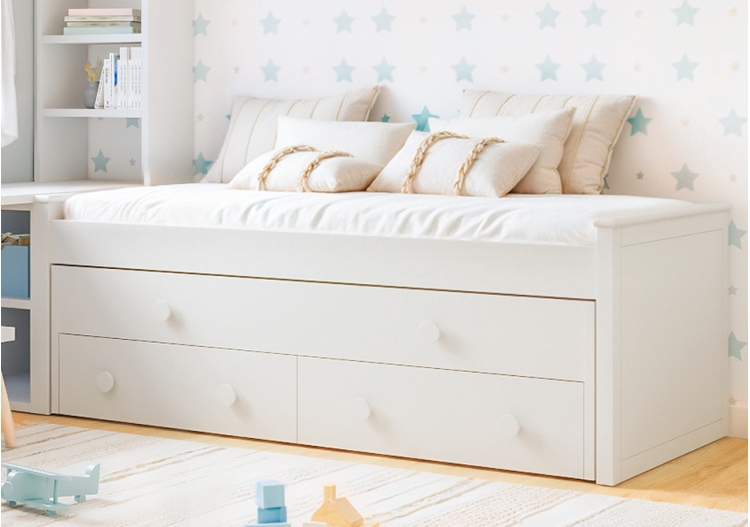 - Composición de la cama compacta: Cama superior + cama nido central + 2 cajones