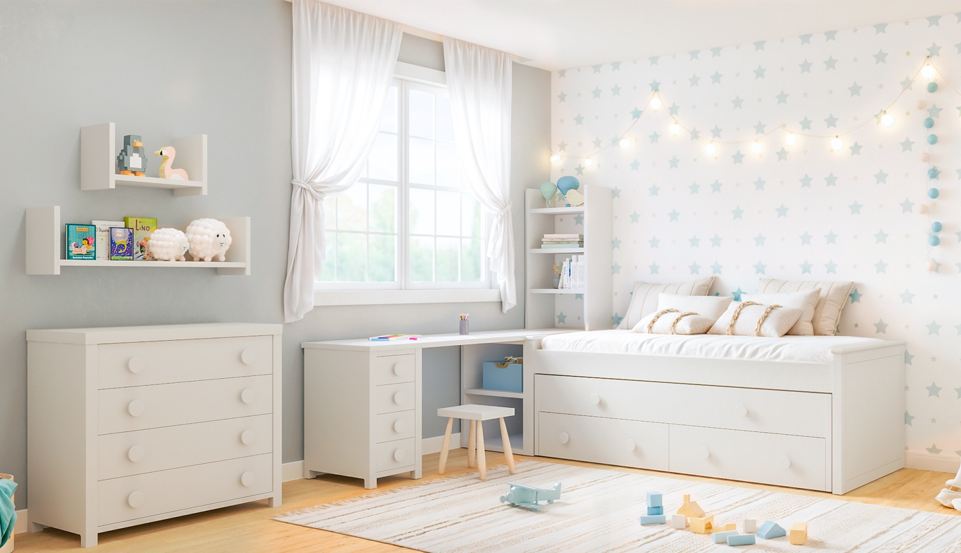 Sus líneas rectas y depuradas y el acabado lacado le darán al dormitorio juvenil esa calidez que se necesita en la etapa más importante del crecimiento de los mas peques de la casa
