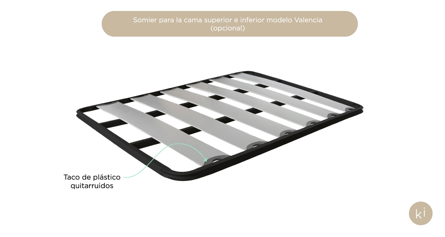 - Somieres: No Incluye ningún somier, para cama superior e intermedia recomendamos el "Somier de láminas de madera Valencia" y lo encontrarás en el carrusel de " Completa tu selección con...", (la cama no incluye ninguna tabla, se requieren somieres)