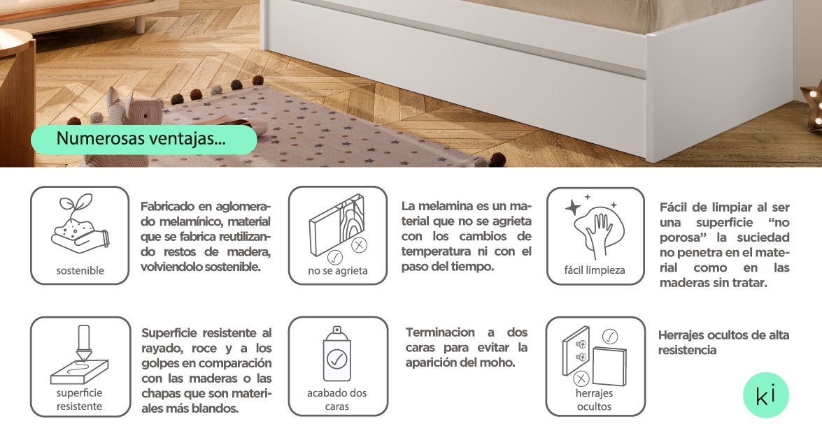 - Calidad del acabado: Máxima calidad, utilizamos una melamina de gran gramaje canteada con PVC de 1mm (garantía de buena adherencia)