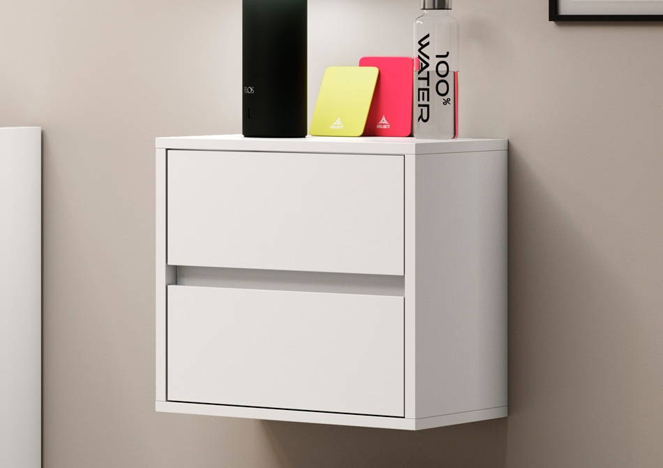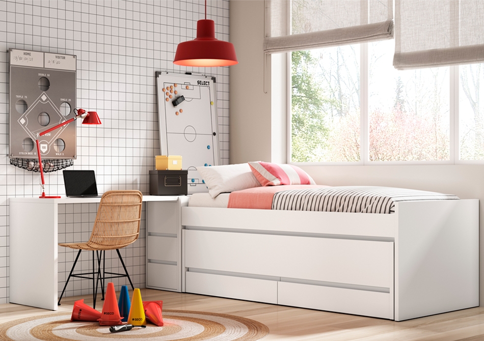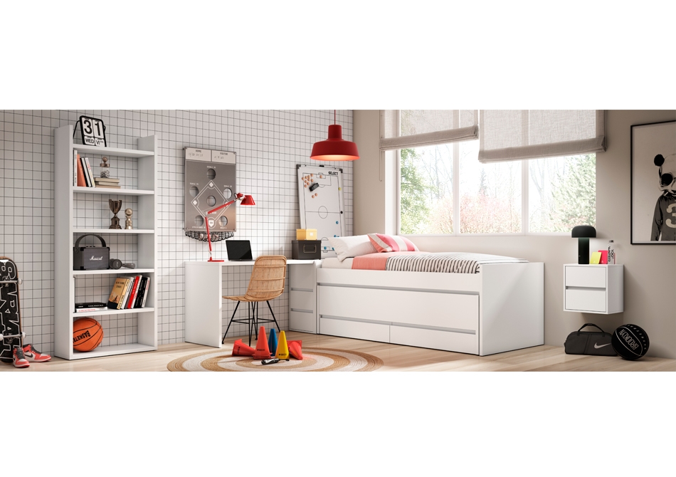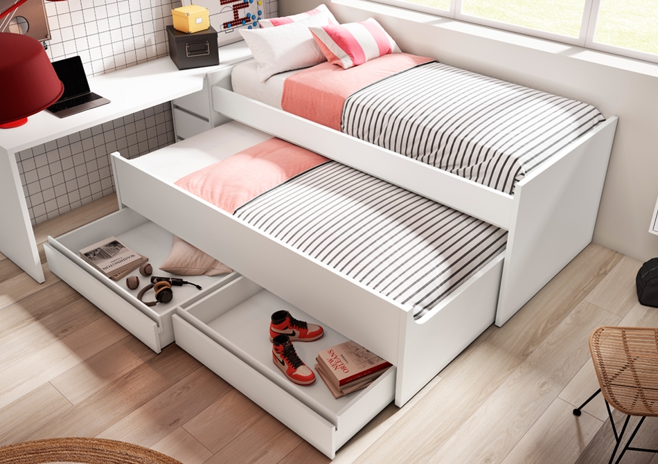 La cama compacta modelo Duna, con cama nido y dos cajones inferiores, es perfecta para descansar y mantener el orden con espacio extra de almacenaje. La acompaña una mesita de noche a juego, con dos cajones para tener lo imprescindible siempre a mano.