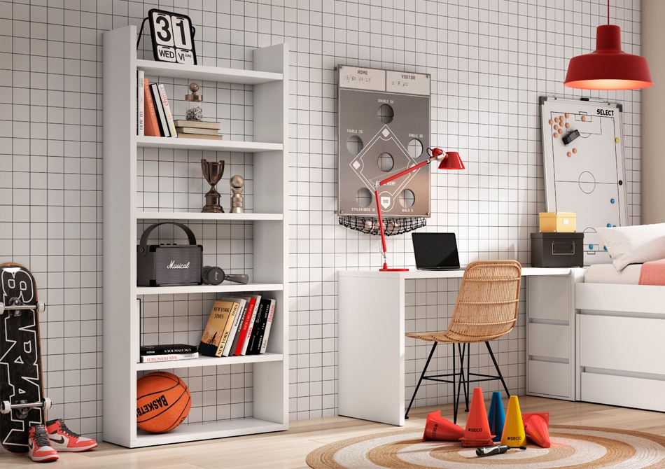 El escritorio con pata diáfana y módulo esquinero, equipado con una puerta y dos cajones, crea una zona de estudio amplia, organizada y bien integrada al conjunto. Completamos la propuesta con una estantería de pie independiente, ideal para libros, trofeos o elementos decorativos que refuercen el estilo deportivo.